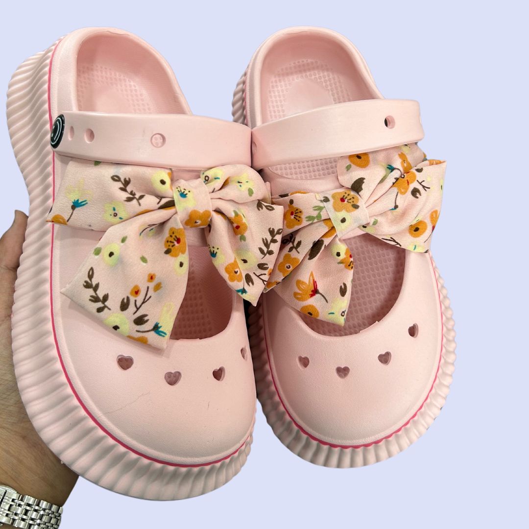 Introducing Pick N Jump's "Baby Pink Bow Clogs" – the epitome of sweetness and style in every step.