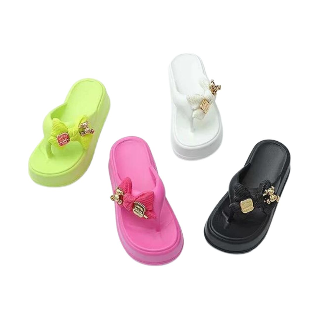 The flip flop is designed with attention to detail and aesthetics. The bow design adds a touch of elegance and femininity to the footwear, making it suitable for various occasions, from beach outings to casual hangouts.The metal teddy bear embellishment further enhances the flip flop's appeal. The teddy bear's metallic finish could shine or glimmer in the sunlight, drawing attention to the footwear and creating a focal point.The thick sole of the flip flop not only contributes to its visual appeal but also provides practical benefits. The added thickness can offer additional cushioning and support, making it more comfortable for extended periods of wear. The sole might also have a textured or contoured surface, enhancing grip and stability while walking.